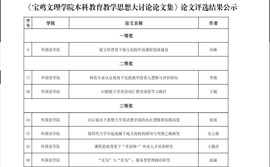 此次论文获奖展示了我院教师对于本科教育教学研究的热情,为教育教学改革提供了理论支持和实践经验。教改论文从多元视角对外语课程思政、师范专业认证以及人工智能赋能外语教学等话题展开探究,充分彰显了我院教师的学术素养以及对教学工作的深度思考。 学院将进一步鼓励教师们积极参与教育教学研究,提升人才培养质量。