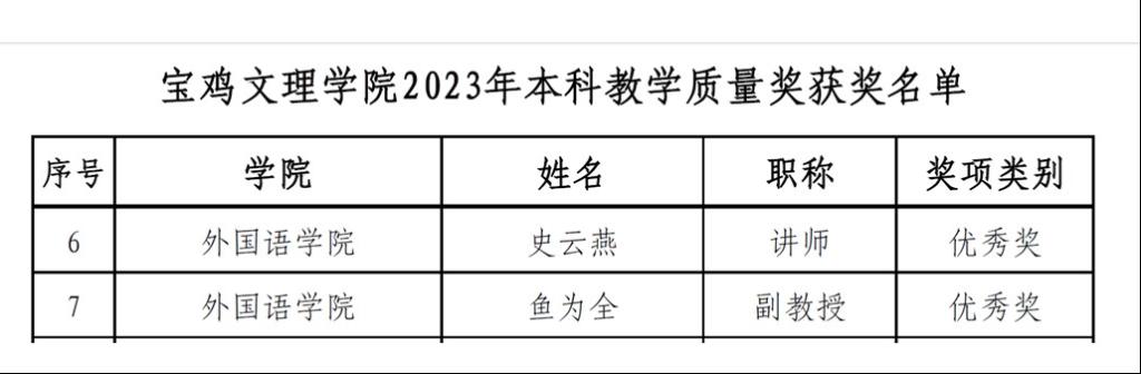 11月3日,我校发布了《关于公布太阳成tyc9728集团2023年本科教学质量奖评选结果的通知》,在2023年太阳成tyc9728集团本科教学质量奖获奖名单中,我院史云燕、鱼为全2位教师获得优秀奖。