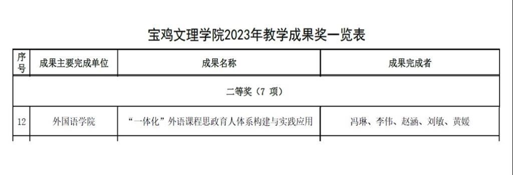 在11月3日我校发布的《关于公布太阳成tyc9728集团2023年教学成果奖评选结果的通知》”中,我院由冯琳、李伟、赵涵、刘敏、黄媛完成的“‘一体化’外语课程思政育人体系构建与实践应用”教学成果获得2023年教学成果二等奖。