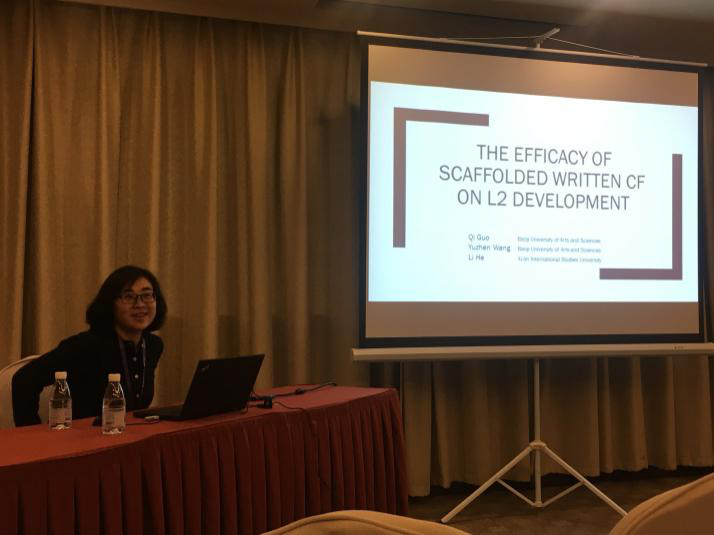 我院郭琪博士在会议上做了题为“The efficacy of scaffolded written CF on L2 development”的发言,并和参会的其他学者进行探讨,反响良好。王宇珍老师在研讨环节分享论文《“四层学习身份”模型下英语思辨写作教学探究》的研究成果,与其他院校同行一起探讨如何借助写作教学更好地培养学生思辨能力。