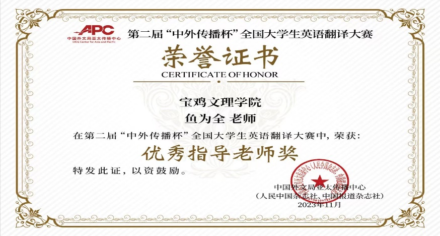近日,第二届“中外传播杯”全国大学生英语翻译大赛结果公布,我院2023级翻译硕士研究生周怀智同学获得A类研究生组全国二等奖,指导老师鱼为全副教授获得优秀指导老师奖。