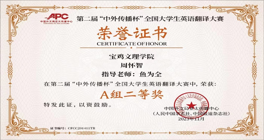 第二届“中外传播杯”英语翻译大赛由中国外文局亚太传播中心(人民中国杂志社、中国报道杂志社)面向国内外高校全日制在校生举办,旨在发展和培养更多的英语能力卓越人才。本次大赛2023年8月21日开始,10月9日结束,采取线上比赛的形式,参赛者按照组别挑选文章进行汉译英翻译。来自上海外国语大学、北京外国语大学、广东外语外贸大学、大连外国语大学、西安外国语大学等高校的学生参加了本次比赛。