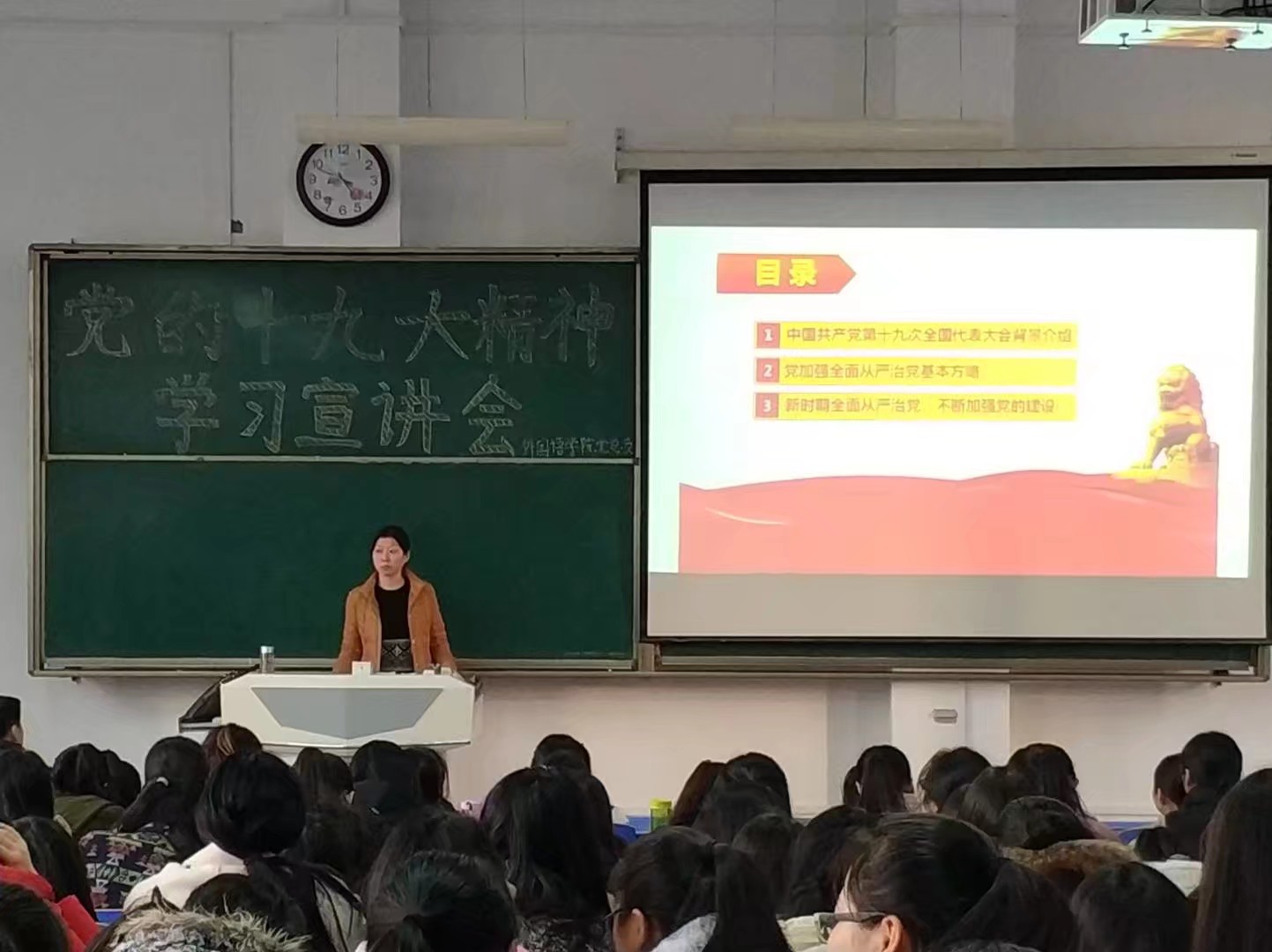 本次宣讲会以开启全面从严治党新征程,学习贯彻党的十九大精神为主题。张选朝从十九大召开的背景、加强全面从严治党、加强党风建设等三方面对十九大精神进行宣讲。他阐述了党中央坚持全面从严治党的决心与毅力,推进中国社会主义建设逐渐走向成熟。强调了中国共产党是学习的政党、实践的政党、自省的政党,希望广大青年学习党的良好品质。最后孙勇民在总结讲话中对学生提出两点要求,一是希望同学们积极配合团总支开展关于十九大的各项教育实践活动,二是希望同学们在学习生活中贯彻十九大精神,并希望十九大在同学们未来学习生活中起到积极作用。