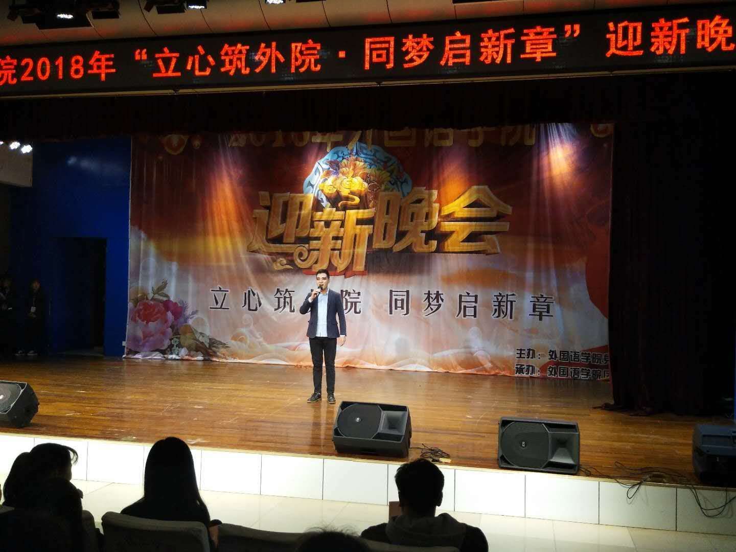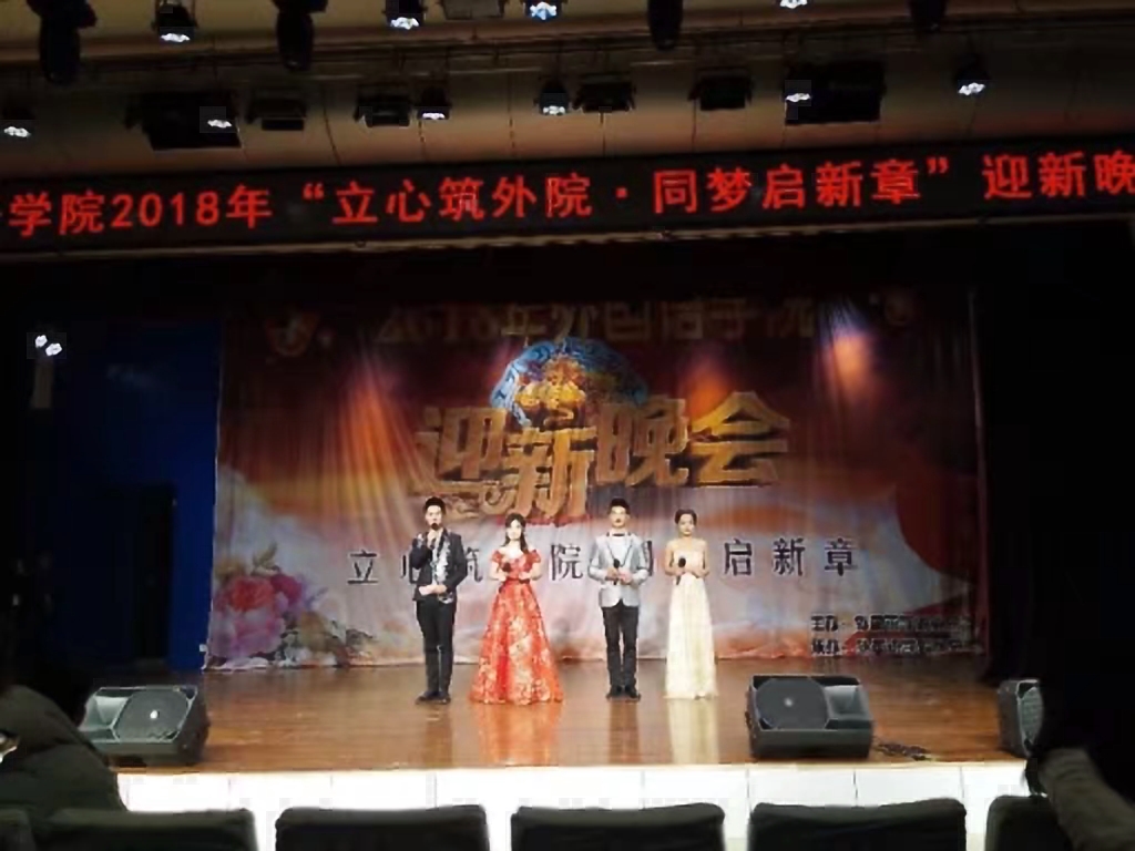 12月12日晚,9728太阳集团在新校区音乐厅举办了“立心筑外院 同梦启新章”2018年迎新晚会。院长王卫强、党总支副书记苗亚静、副院长史传龙,部分教师、辅导员以及400余名学生观看了迎新晚会。